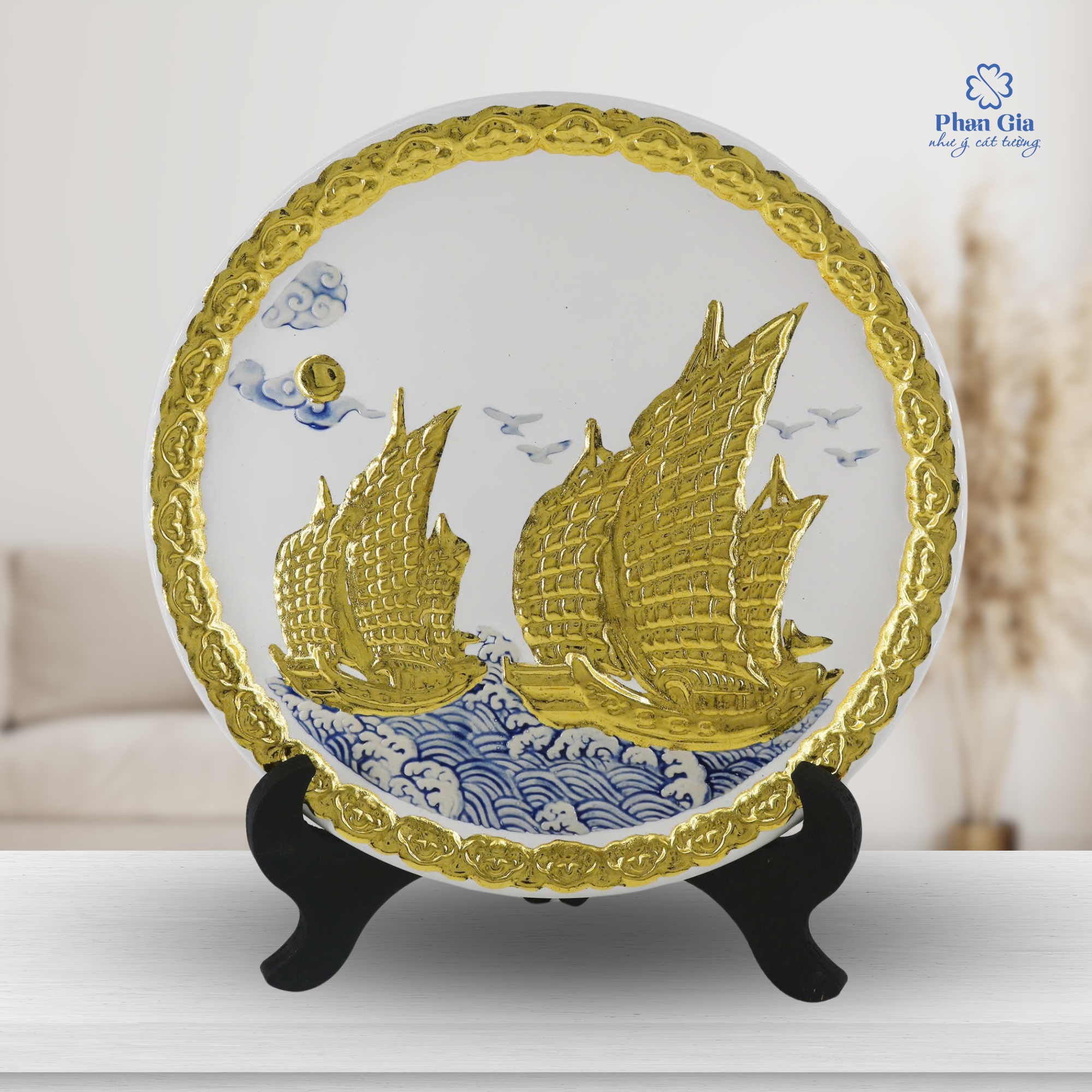 Liên hệ ngay Phan Gia để sở hữu đĩa gốm Thuận Buồm Xuôi Gió đắp nổi dát vàng – vật phẩm mang lại may mắn, tài lộc và thành công cho bạn và người thân.