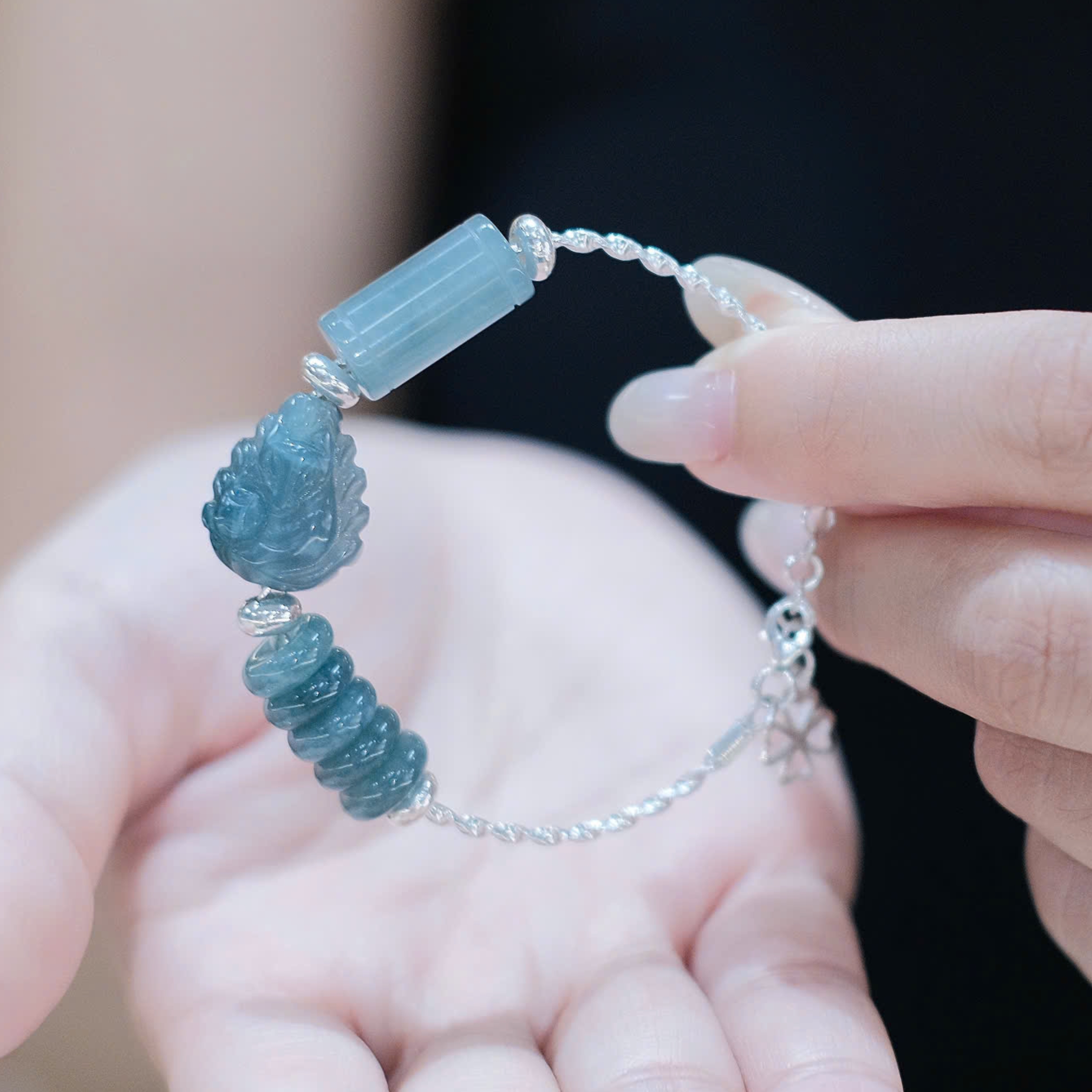 Sự kết hợp giữa đá Lam Ngọc tự nhiên và các linh vật phong thuỷ như Hồ Ly, Đồng Điếu và Lu Thống không chỉ gia tăng giá trị thẩm mỹ cho vòng tay, mà còn mang lại nhiều công dụng phong thuỷ vượt trội: