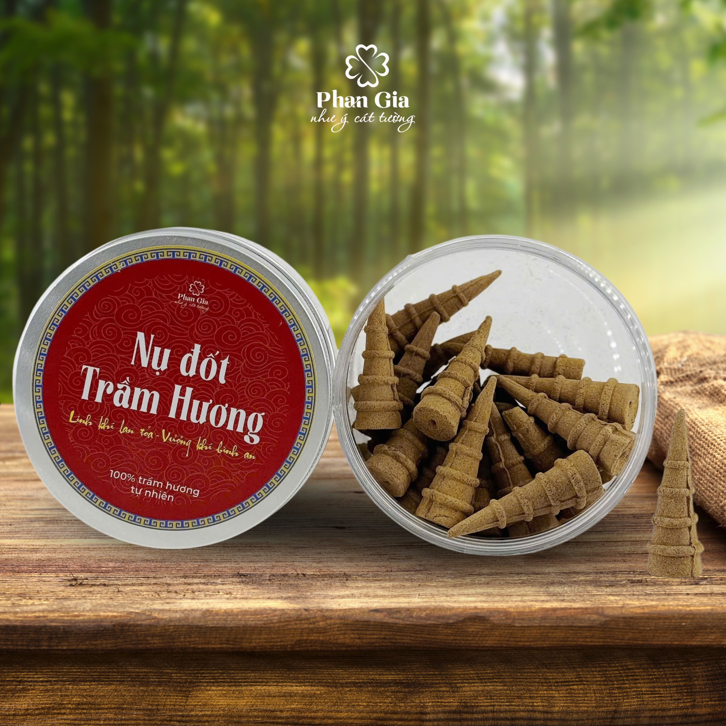 Nụ đốt trầm hương Hà Tĩnh là sản phẩm được làm từ bột trầm hương tự nhiên khai thác tại Hà Tĩnh, kết hợp với keo thực vật, ép thành hình nụ tháp nhỏ gọn. Khi đốt, nụ trầm cháy âm ỉ từ trên xuống, tỏa ra mùi hương trầm ấm, sâu, thanh và rất dễ chịu.